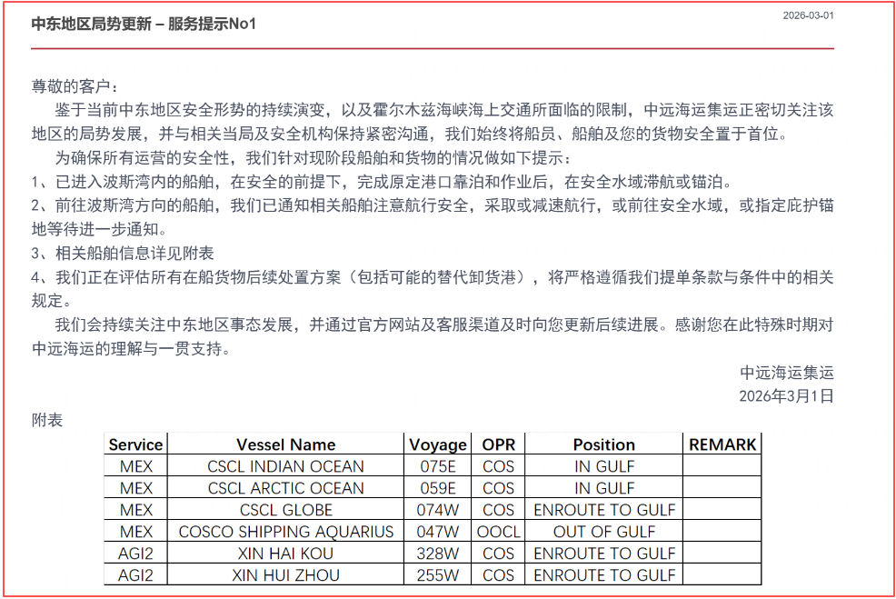 COSCO中远海运:已进入波斯湾内的船舶,在安全的前提下,完成原定港口靠泊和作业后,在安全水域滞航或锚泊。