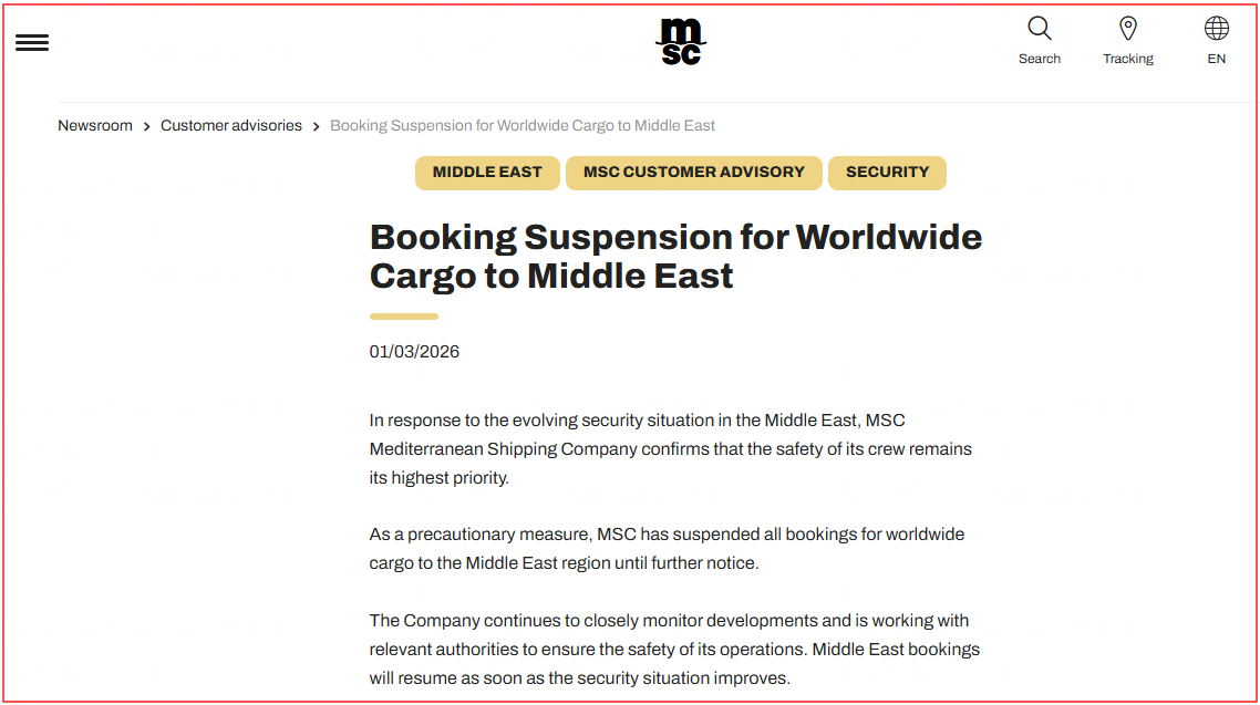 MSC:作为预防措施,MSC已暂停所有全球中东地区的货运预订。